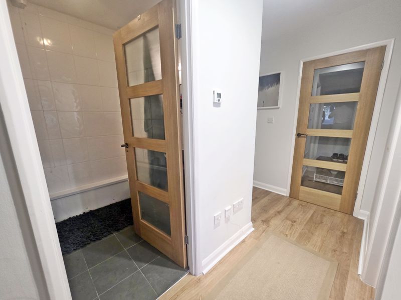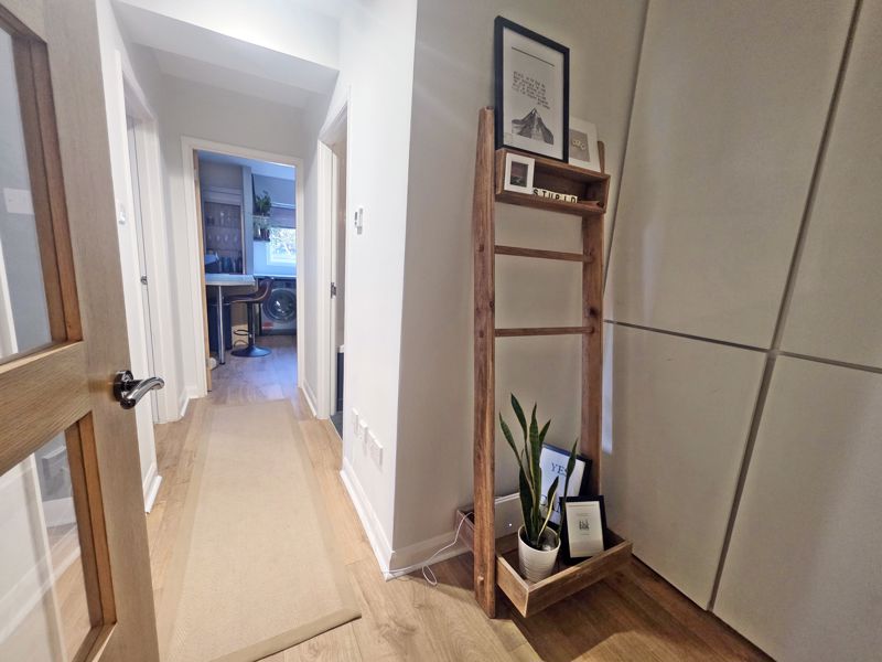 Plain ceiling with ceiling light point and entry phone receiver. Access to cloaks / storage cupboard with hanging rail. Night storage heater. Glazed door leads through to entrance hallway with plain ceiling and railed ceiling light point. Airing cupboard with pre-lagged hot water cylinder and further shelved storage. Central heating thermostat, telephone/ broadband point. Karndean flooring