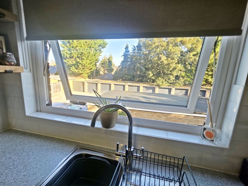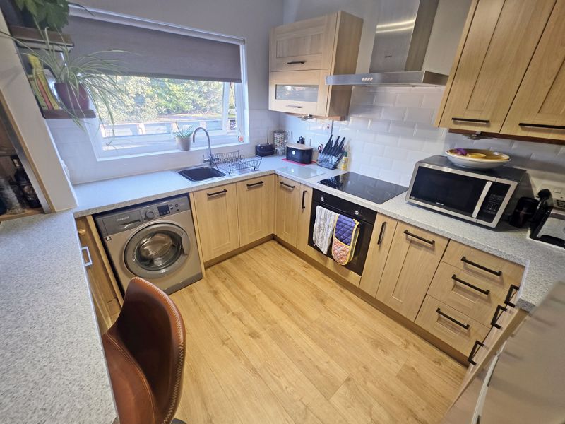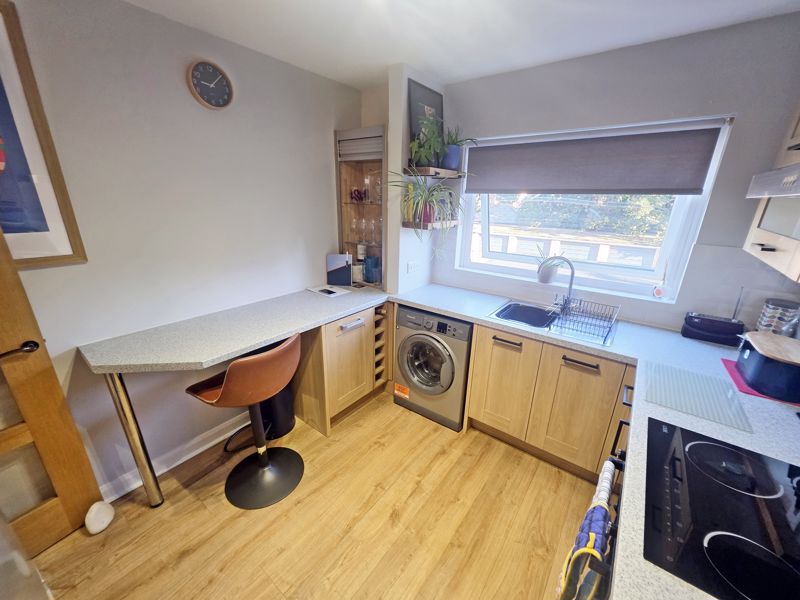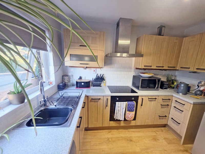 Plain ceiling with ceiling light point and UPVC double-glazed window to rear aspect. A range of wall and base mounted units with under lighting and work surfaces over. Single bowl single drainer sink unit with mixer tap. Integrated electric oven with electric hob and cooker hood. Space for fridge / freezer, space and plumbing for washing machine and fitted breakfast bar. Splash back tiling and Karndean flooring.