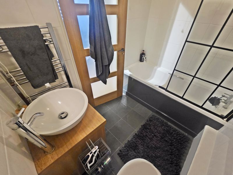 Plain ceiling with ceiling light point and fitted extractor. Panelled bath with fitted shower screen and electric shower over. Vanity unit with inset wash hand basin and mixer tap. Low-level WC. Tiled walls, tiled flooring and combined light and shaver point.