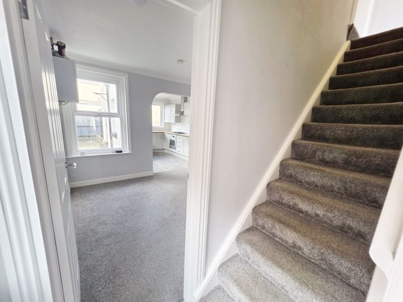 Coved and textured ceiling with ceiling light point and mains wired smoke detector. UPVC double-glazed window to rear aspect. Wall mounted gas central heating boiler and central heating controls. Double panelled radiator. Access to understairs storage cupboard housing electric meter and consumer unit. Archway leads to: