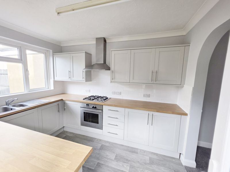 A range of wall and base mounted units with work surfaces over. One-and-a-quarter bowl single drainer sink unit with mixer tap. Integrated electric oven with four burner gas hob and cooker hood over. Space and plumbing for washing machine and space for under counter fridge/freezer. Splash back tiling and lino flooring.