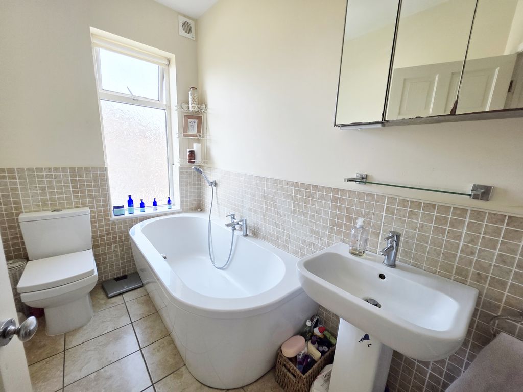 Plain ceiling with ceiling light point and extractor. Frosted UPVC double-glazed window to front aspect. Double ended bath with central shower mixer tap. Close coupled WC. Pedestal wash hand basin and shower cubicle with thermostatic shower valve. Tiled walls, tiled flooring and heated chrome ladder style towel rail.