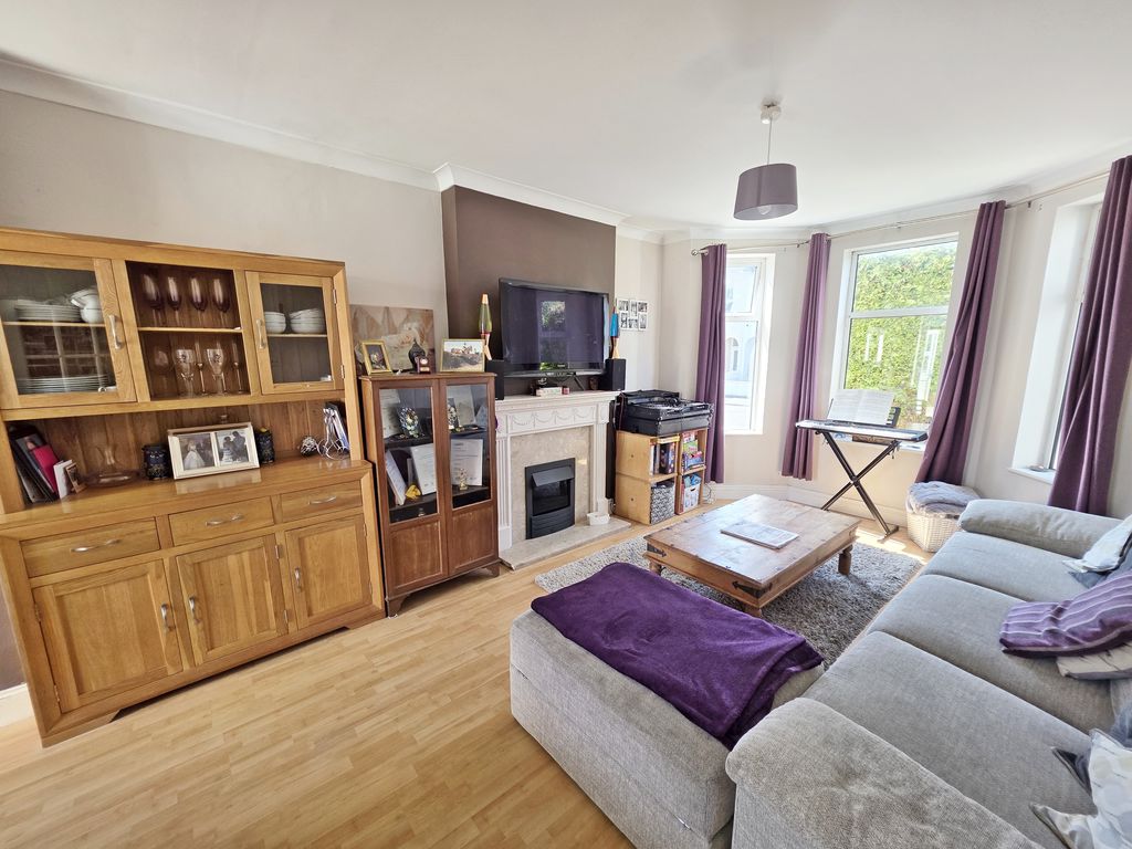 Plain coved ceiling with two ceiling light points. UPVC double-glazed bay window to front aspect. UPVC double-glazed double casement doors leading to garden. Two double panelled radiators, fire surround, TV point and telephone point. Wood laminate flooring.