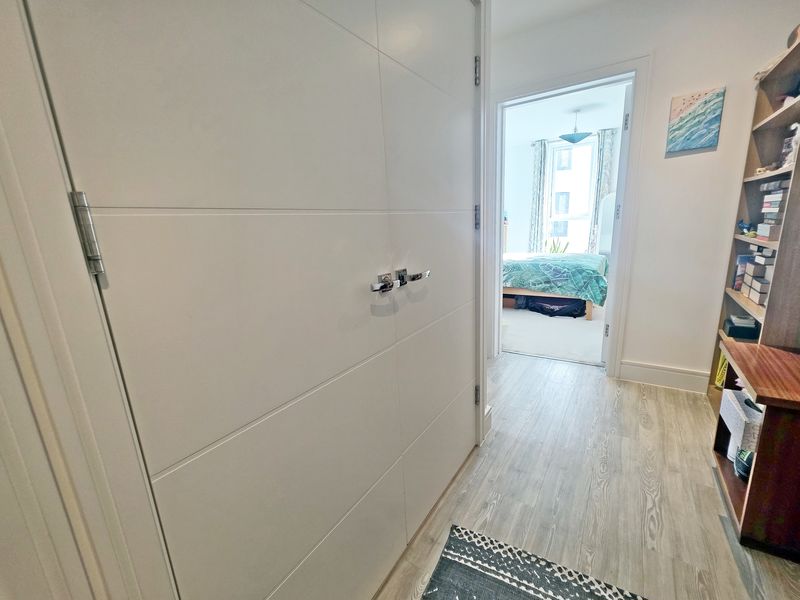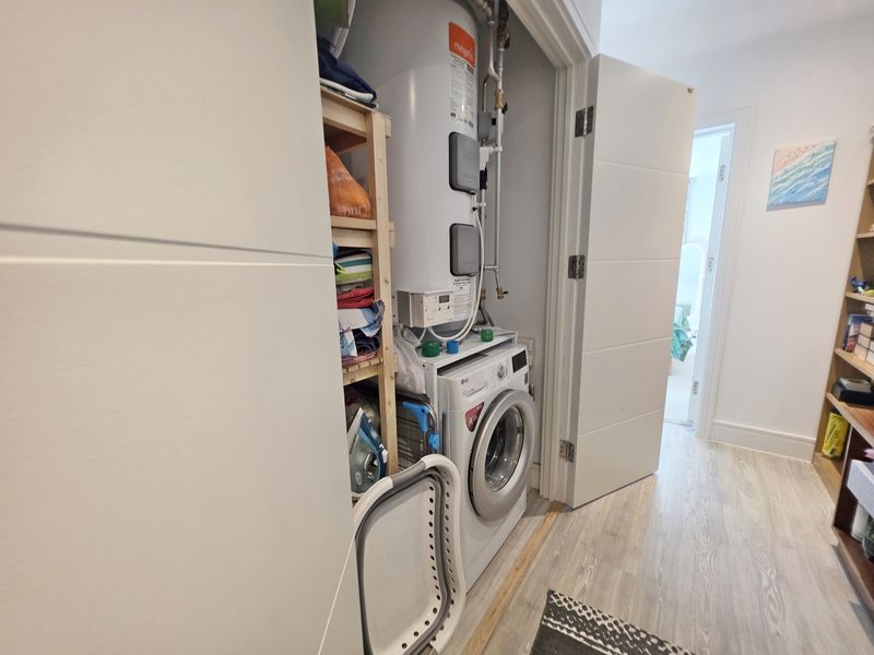 An L-shaped room. Plain ceiling with recessed down lighting and mains wired smoke detector. Central heating controls and audio-visual entry system. Cupboard housing electric meter and consumer unit. Double-doored storage and utility cupboard with space and plumbing for washing machine, shelving and housing pressurised hot water cylinder. Under floor heating controls. ‘Amtico’ vinyl laminate flooring.