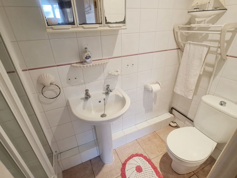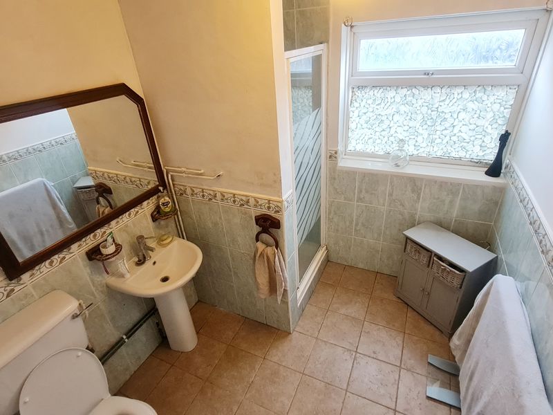 Plain coved ceiling with ceiling light point. UPVC double-glazed frosted window to rear aspect. Shower cubicle with thermostatic shower valve. Pedestal wash hand basin and low-level WC. Half tiled walls, panelled radiator and tiled flooring.