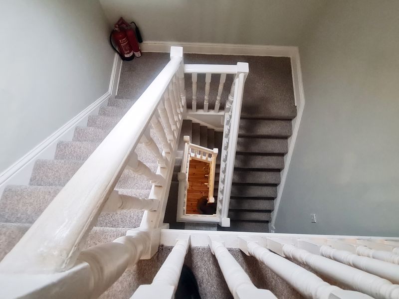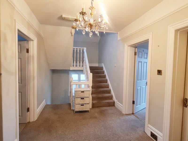 Staircase from hallway to first floor landing. At half landing, single-glazed window to side aspect. At landing level, papered ceiling with ceiling light point and picture rail. Main sired smoke detector.