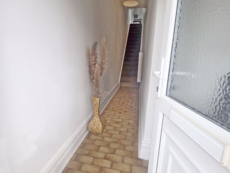 Coved and textured ceiling with ceiling light point and tiled flooring. Recessed coat storage. Stairs lead to first floor.