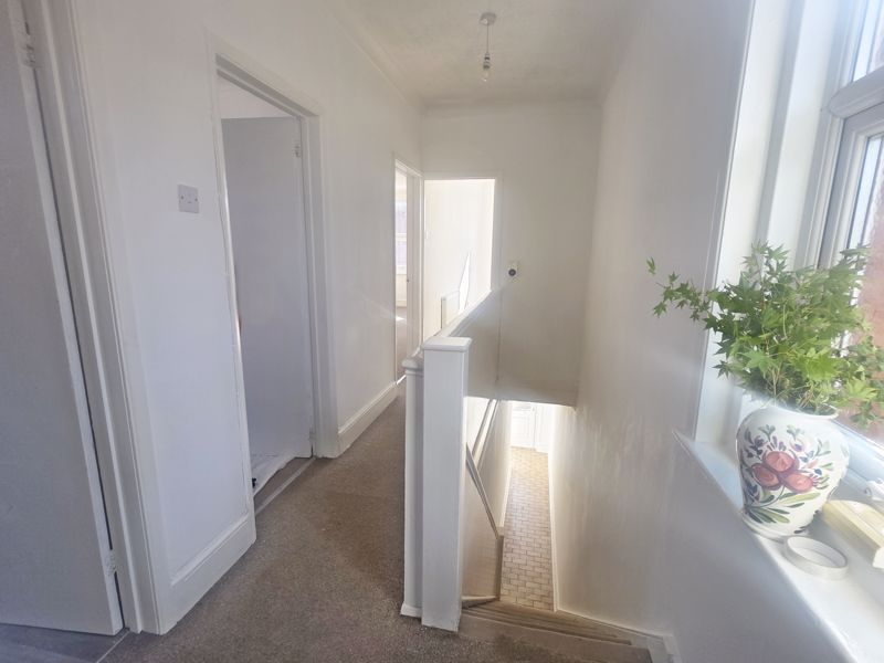 Coved and textured ceiling, ceiling light point and hatch providing access to loft. Frosted UPVC double-glazed window to side aspect.