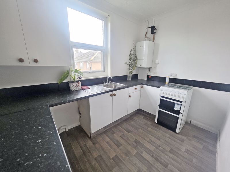 A range of wall and base mounted units with work surfaces over. Single bowl single drainer sink unit. Space and connection for gas cooker. Space and plumbing for washing machine, space for under counter fridge and freezer. Wall mounted gas central heating combination boiler. Splash back tiling.
