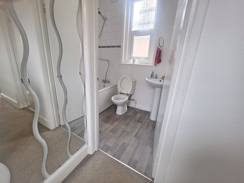 Coved and textured ceiling with ceiling light point and frosted UPVC double glazed window to side aspect. Panelled bath with shower mixer tap. Pedestal wash hand basin and low-level WC. Single panelled radiator. Tiled walls.