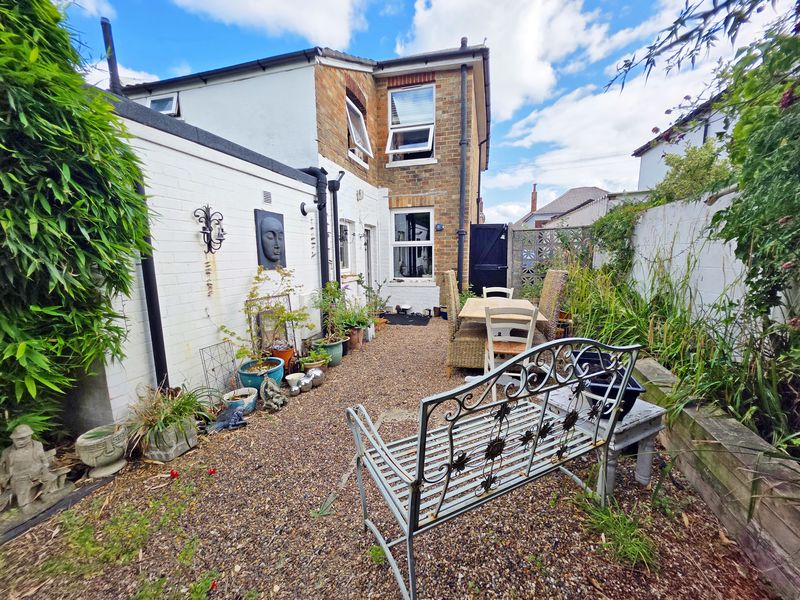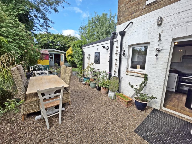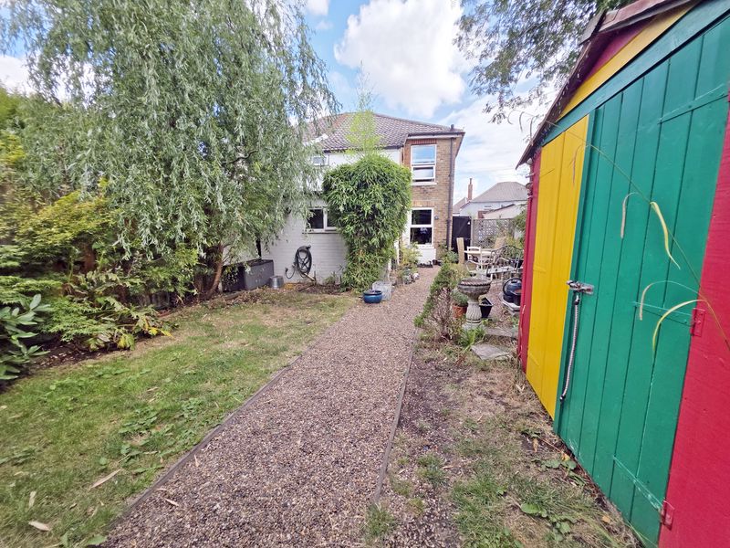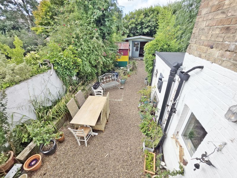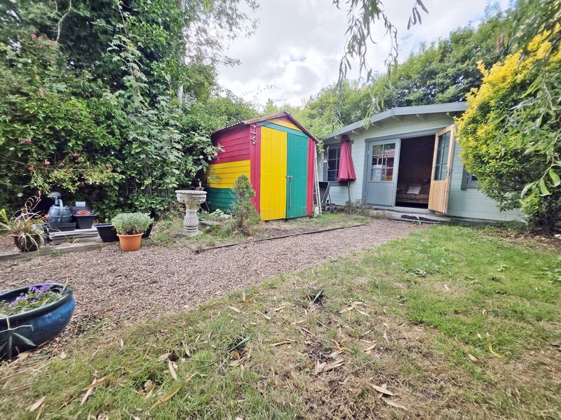 Rear garden being to a southerly aspect laid partly to shingle with the remainder laid to lawn. An array of established and mature tree, bushes and screening shrubs. Hard standing for garden shed.