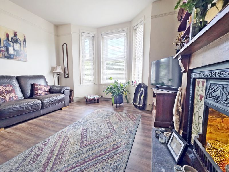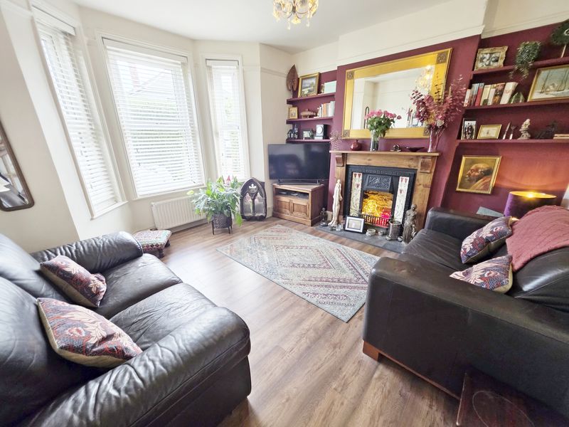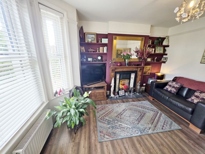 Plain ceiling with plaster centre ceiling rose, ceiling light point and picture rail. UPVC double-glazed feature bay window to front aspect. Double panelled radiator with further single panelled radiator. Fire surround with open fire and TV/media point. Wood laminate flooring.