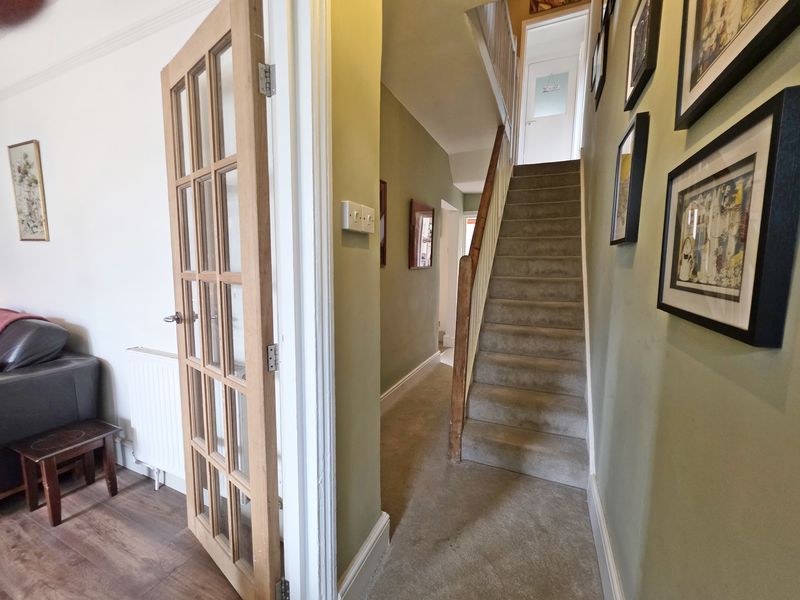 Driveway accessed via dropped pavement and laid to hard standing providing off road parking. Remainder of front garden having an area of lawn and screening hedgerow. UPVC double-glazed front door leads into: