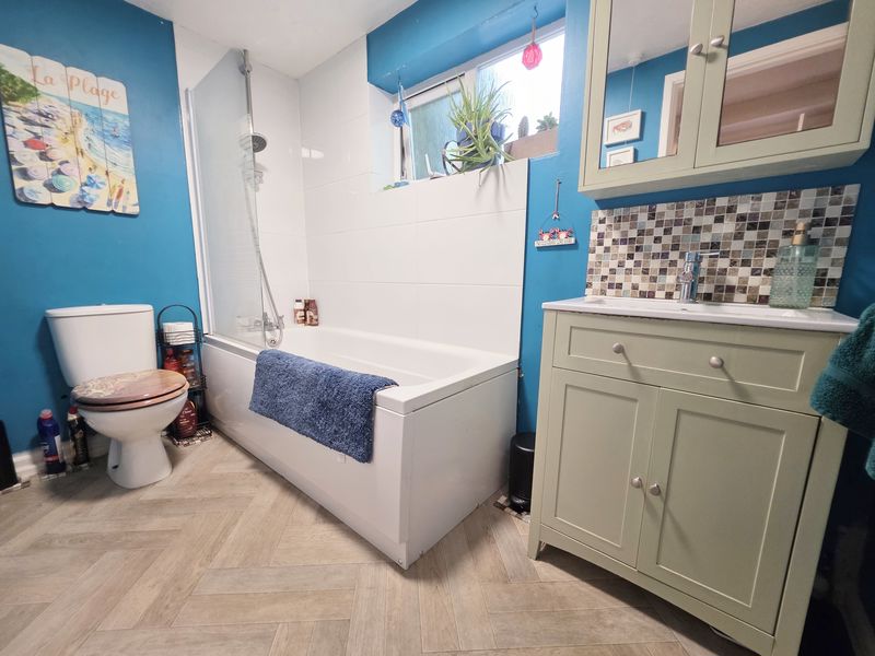 Textured ceiling with ceiling light point. Frosted UPVC double-glazed window to rear aspect. Panelled bath with fitted shower screen and shower mixer tap. Low level WC, vanity unit with inset wash hand basin with mixer tap. Single panelled radiator. Splash back tiling. Combined light and shaver point.