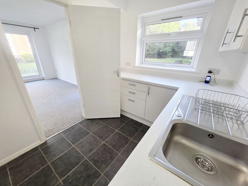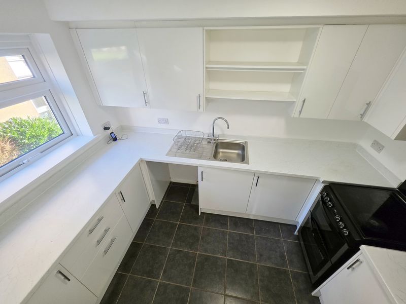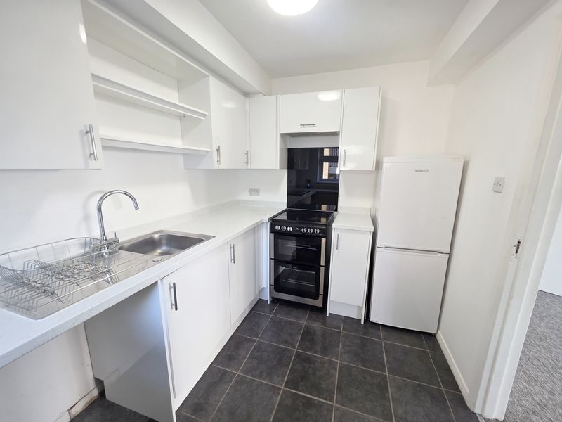 Textured ceiling with ceiling light point. UPVC double-glazed window to side aspect. A range of wall and base mounted units with work surfaces over and upstand splashback. Single bowl single drainer sink unit with mixer tap. Space for electric cooker with fitted glass splashback and cooker hood over. Space and plumbing for washing machine and space for fridge/freezer. Tiled flooring.
