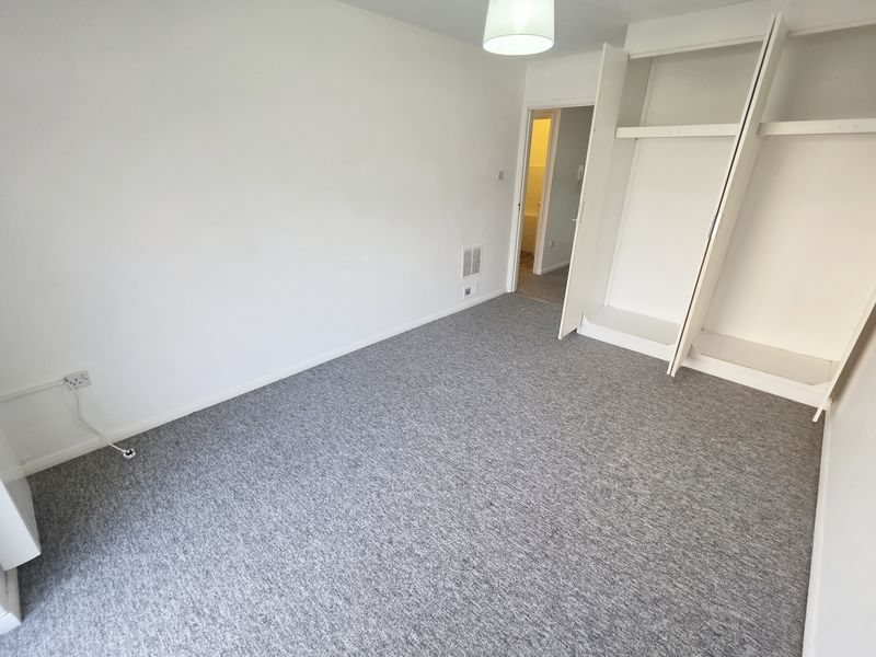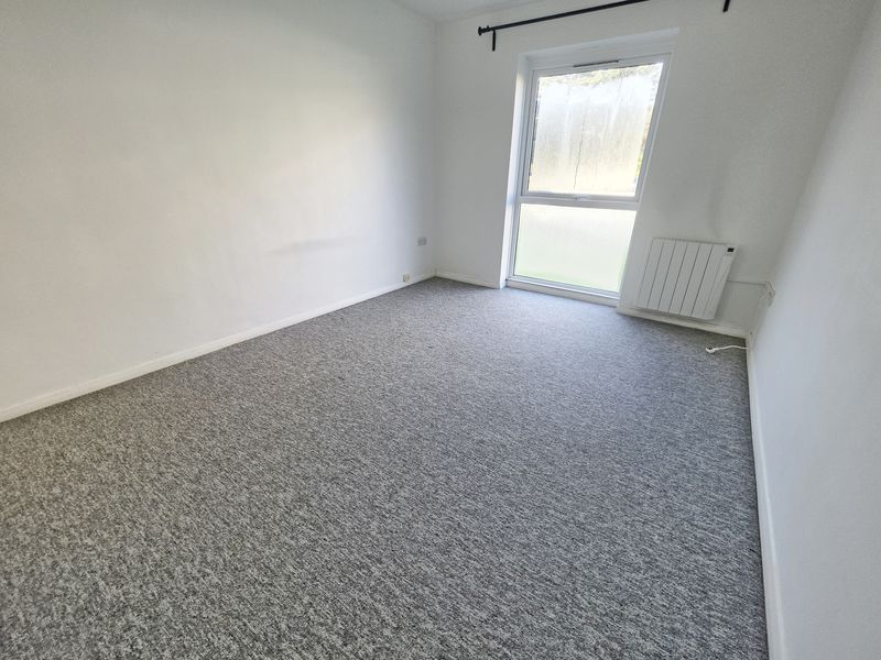 Textured ceiling with ceiling light point. UPVC double-glazed full-length window to rear aspect with views over the communal grounds. Built in wardrobes with hanging rail and overhead storage. Electric heater.