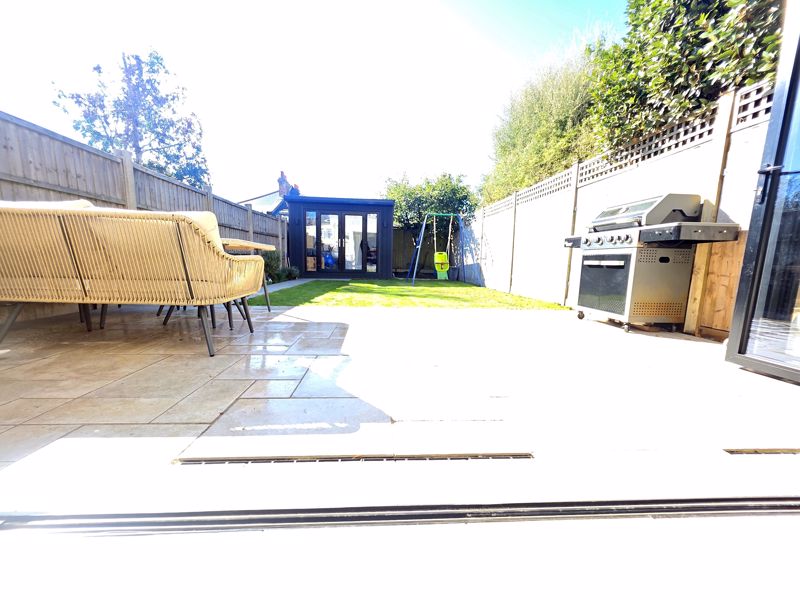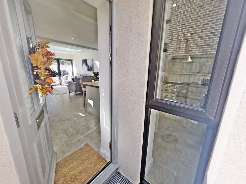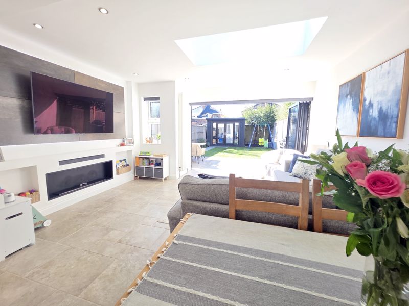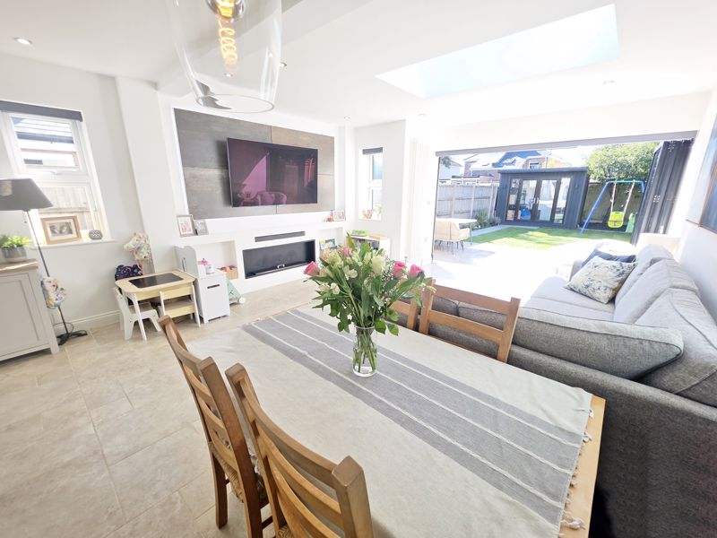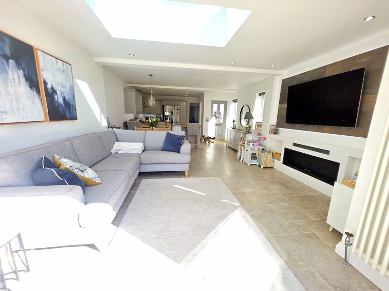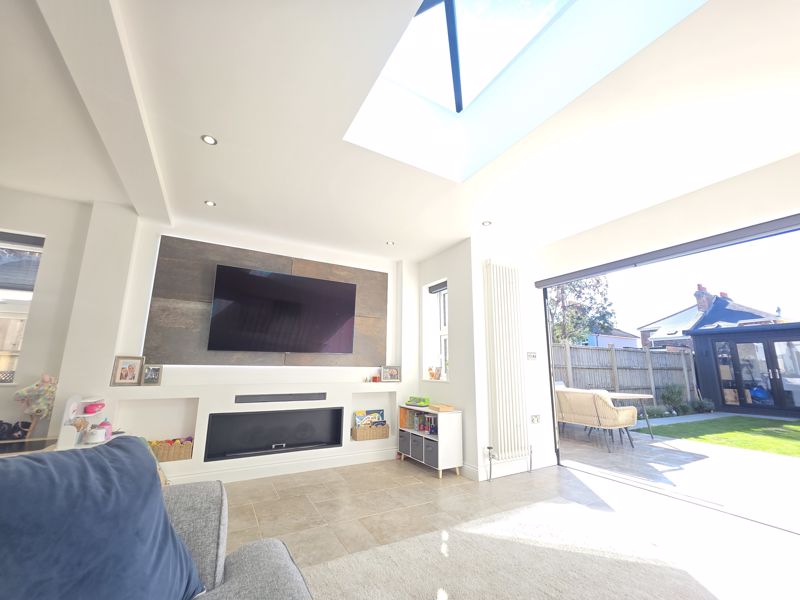Plain ceiling with zoned recessed down lighting points and further feature ceiling light point at dining area. A dual aspect space having UPVC double-glazed floor to ceiling focal side aspect windows (with electric blinds) and further side and rear aspect windows. Aluminium bi-folding doors (with electric blinds) gives level free flowing access to patio and garden. Feature aluminium orangery style skylight with self-cleaning glass. Level floor height to patio with drainage. Feature back lit TV wall (TV not included) with contemporary flame effect gas fire below. TV/media point. Vertical radiator plus underfloor heating to both the reception area and kitchen. Italian stone tiled flooring seamlessly continues to patio and garden pathway.