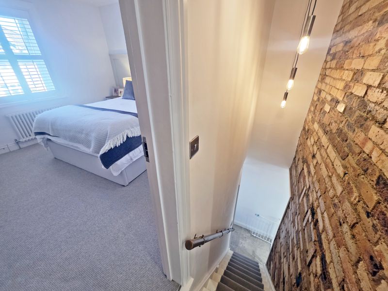 Staircase from inner lobby to first floor landing. Having feature exposed brick wall with focal ceiling pendant light point. Further hallway area with plain ceiling recessed low level down lighting and hatch providing access to loft. Panelled radiator.