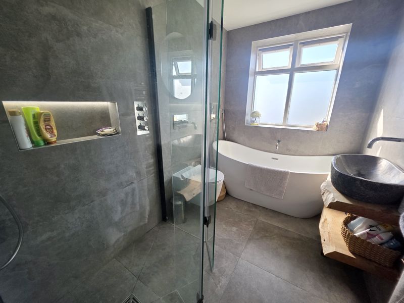 Under floor heating. Plain ceiling with recessed low level down lighting. Frosted UPVC double-glazed window to rear aspect. Double ended tub bath with central tap, handheld shower unit and wall fitted controls. Floating concealed cistern WC. Driftwood style shelving with mounted stone wash hand basin and wall fitted mixer tap. Tanked double walk-in shower with folding glass doors and tiled draining floor. Wall mounted shower controls and feature recessed shelf with lighting. Rainwater effect shower rose and handheld shower attachment. Fully tiled walls, tiled flooring, backlit mirror and fitted extractor. Chromed character radiator and towel rail.