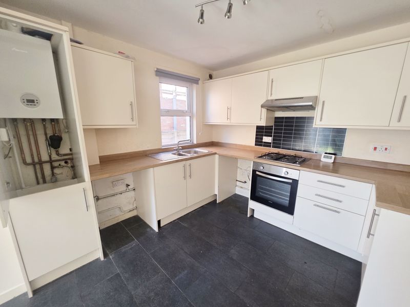 A range of wall and base mounted units with work surfaces over. One-and-a-quarter bowl single drainer sink unit with mixer tap. Integrated stainless steel electric oven with four burner gas hob and cooker hood. Space and plumbing for washing machine and dishwasher. Space for fridge / freezer. Cupboard housing gas central heating combination boiler. Double panelled radiator and tiled flooring.
