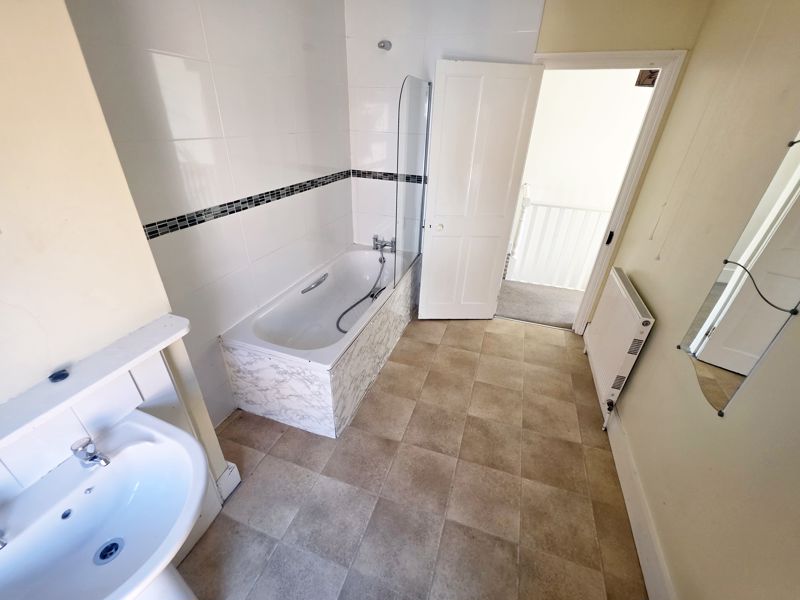 Plain ceiling with ceiling light point. Frosted UPVC double-glazed window to side aspect. Panelled bath with hand rails and shower mixer tap over. Low-level WC, pedestal wash hand basin and single panelled radiator.