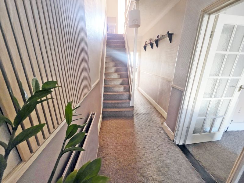 Coved and textured ceiling with ceiling light point and dado rail. Double panelled radiator with recessed under stairs storage. Cloaks storage cupboard and cupboard housing electric meter and fuse board.
