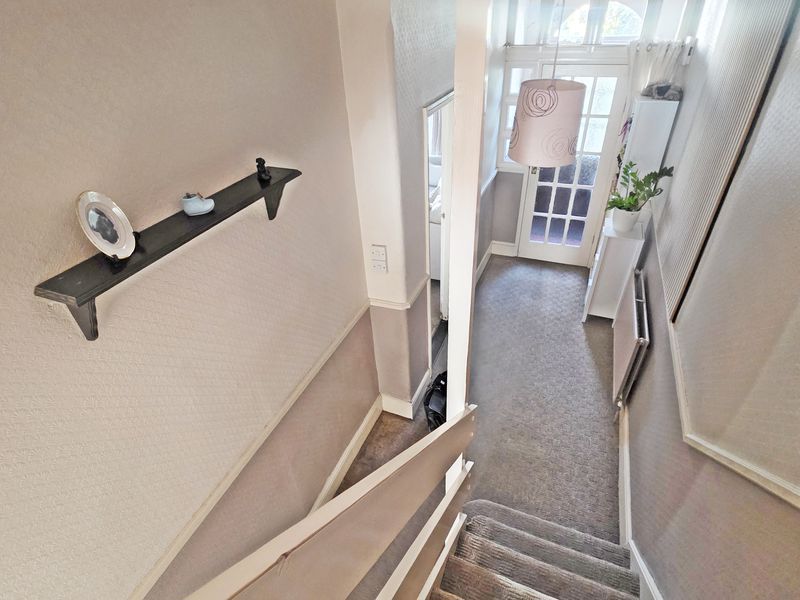 Staircase from hallway to first floor landing. Having coved and textured ceiling with ceiling light point and dado rail.