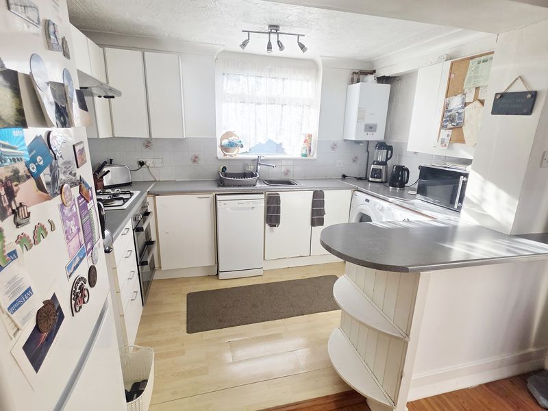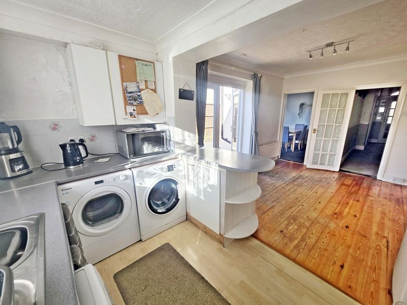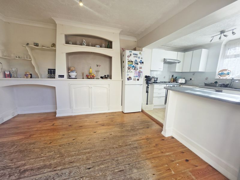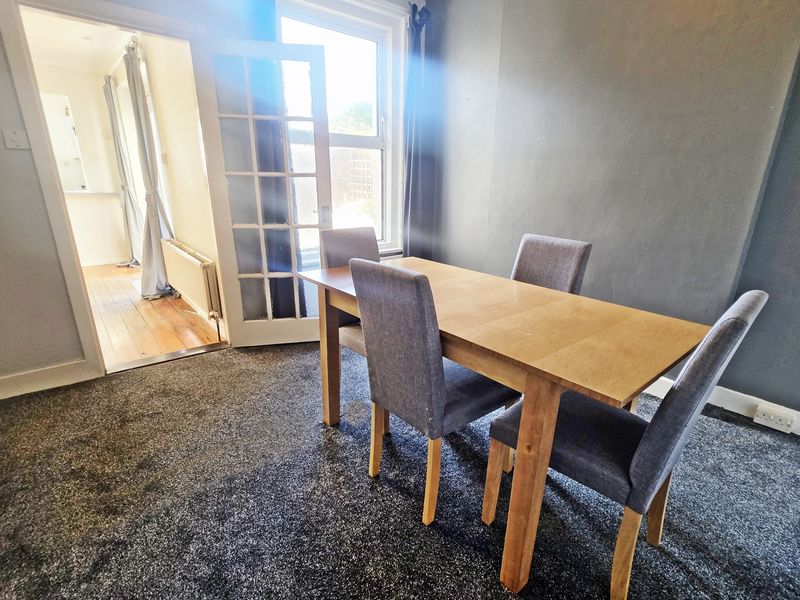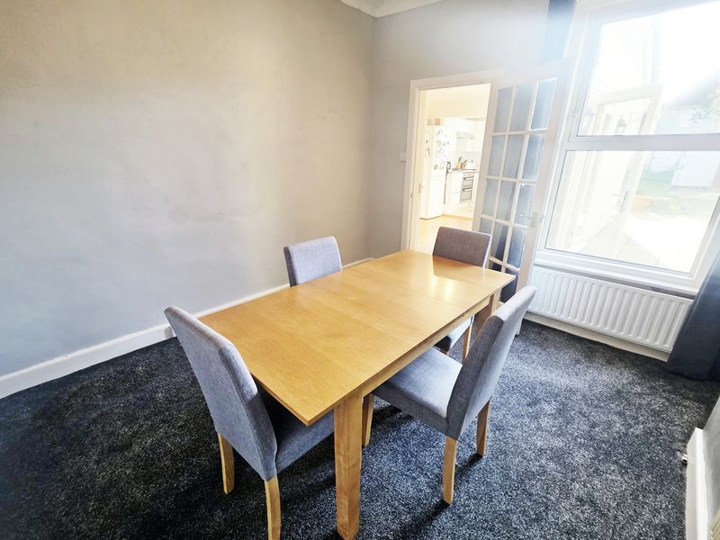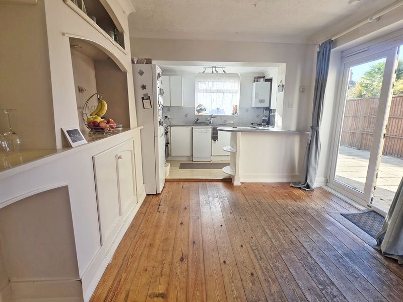 Coved and textured ceiling with two railed down light points. UPVC double-glazed window to rear aspect and double casement doors at side aspect leading to rear garden. Breakfast room area having fitted storage, central heating thermostat and stripped wooden flooring.