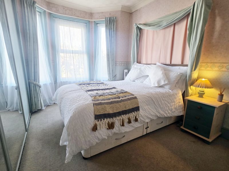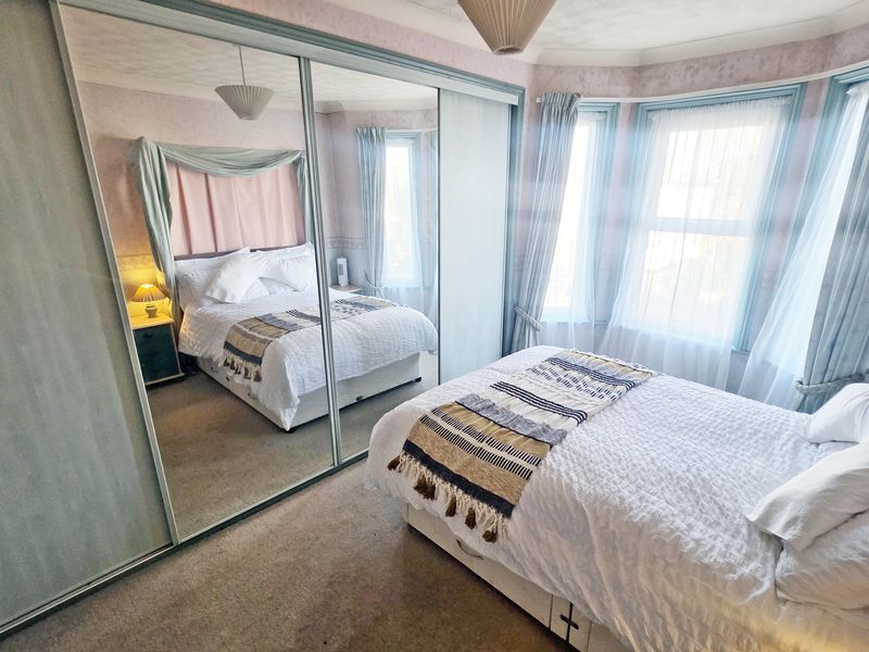 Coved and textured ceiling with ceiling light point. UPVC double-glazed feature bay window to front aspect with single-glazed reveals. Single panelled radiator. A range of fitted part mirror-fronted wardrobes.