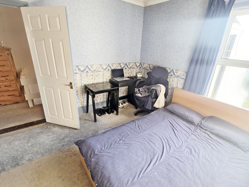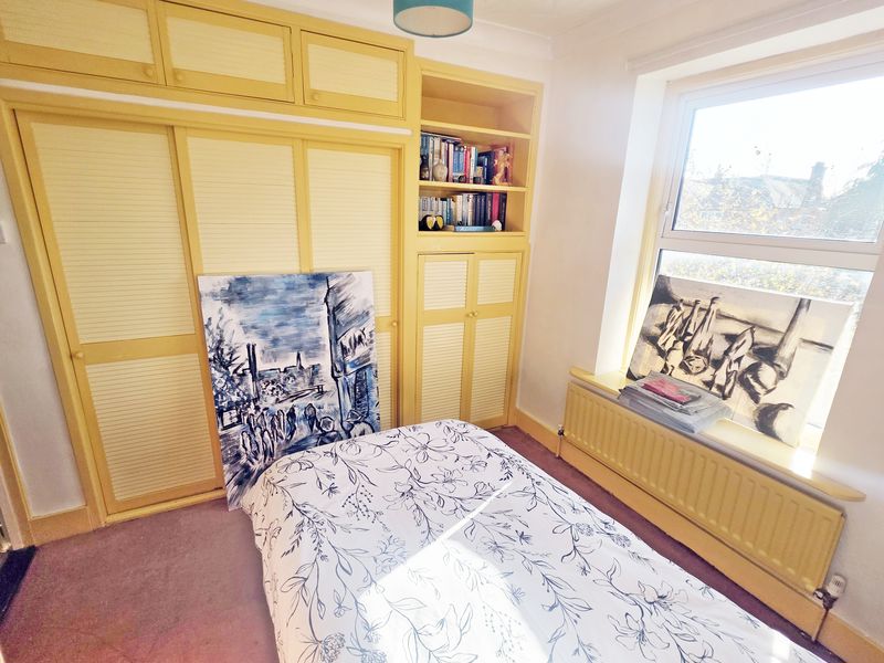 Coved and textured ceiling with ceiling light point. UPVC double-glazed window to rear aspect. Single panelled radiator. Fitted wardrobes with pre-lagged hot water cylinder tank.