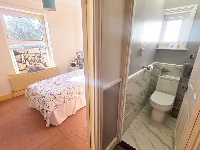 Coved and textured ceiling with ceiling light point. Frosted UPVC double-glazed window to front aspect. Panelled corner bath with shower mixer tap. Pedestal wash hand basin and low-level WC. Recessed shower with electric shower over. Fully tiled walls, tiled flooring and ladder style heated towel rail.
