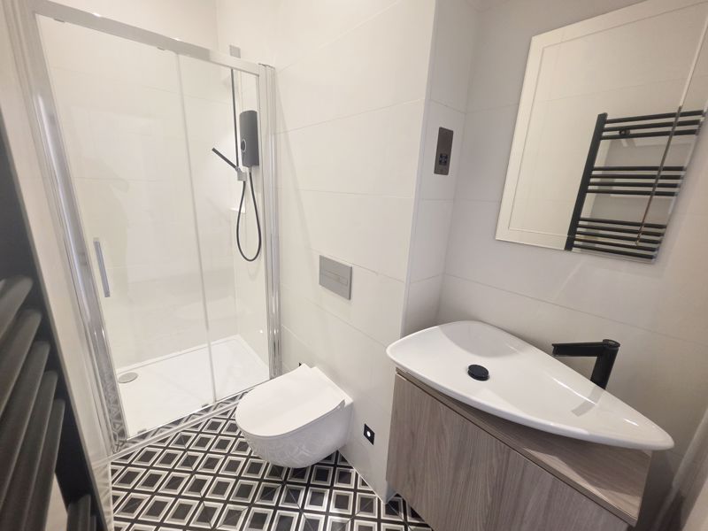 Plain ceiling with low level down lighting and fitted extractor fan. Double shower tray with fitted electric shower. Vanity unit with inset wash hand basin and mixer tap. Concealed cistern WC, ladder style heated towel rail. Feature LED lighting, tiled walls and tiled flooring.